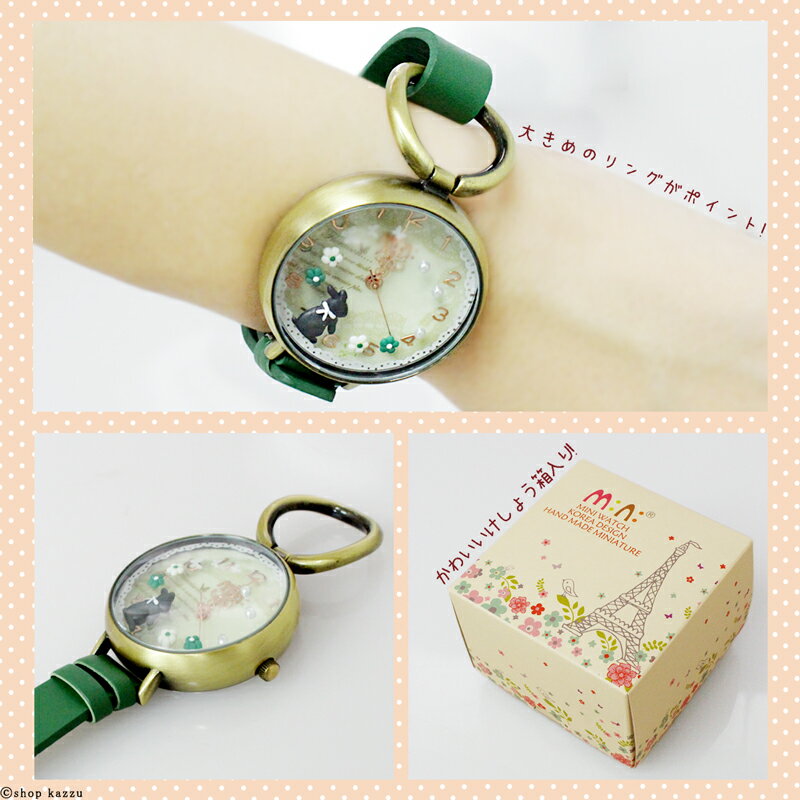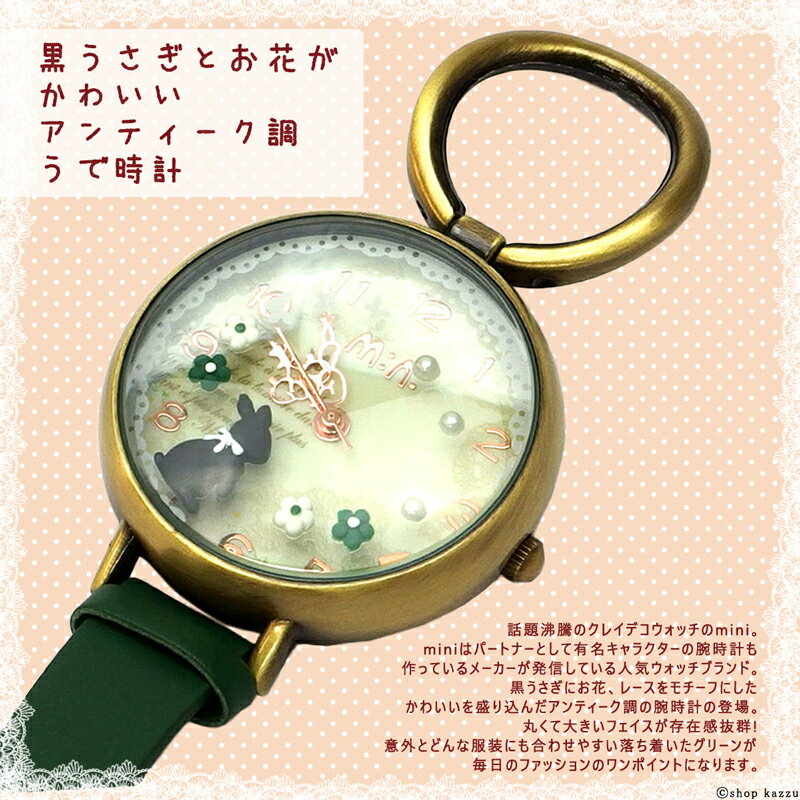 【腕時計 レディース うさぎ 本革ベルト かわいい レース 花 アンティーク ミニチュア ハンドメイド 大きめ アリス ブレスレット】 ミニチュアのうさぎやお花、レースなどかわいい要素が詰め込まれた女性用腕時計。