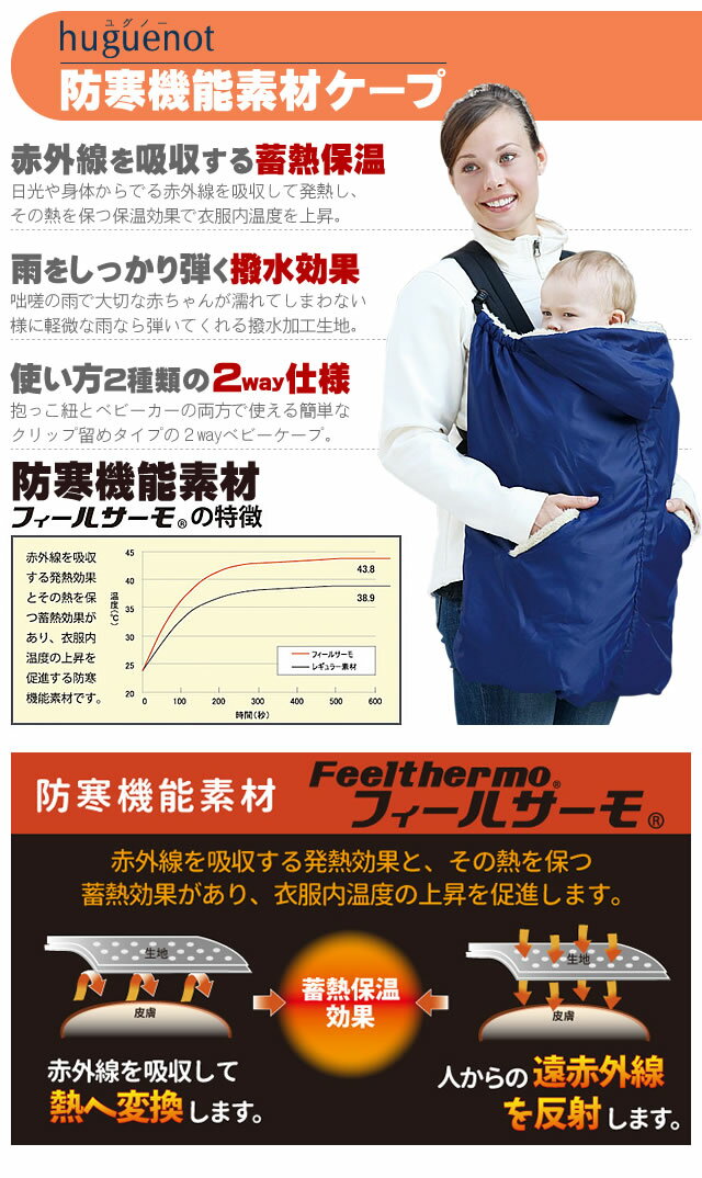 ユグノー huguenot 日本製 ブランド ベビーキャリー 抱っこひも ベビーカー 兼用 保温 撥水 出産祝 出産祝Feelthermo Boa Cape 赤ちゃんのための防寒機能素材ベビーケープのボア裏地仕様。