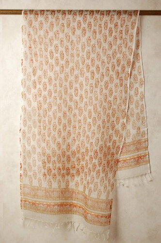インド サンガネールプリント(木版染め)シルクコットンストール(マフラー、ショール、スカーフ) 白 オレンジ系 花柄 【アジアン】【インド更紗】【プレゼント】【YDKG-f】【エスニック】【税込3,980円で送料無料!】【ネコポスOK】+A+H