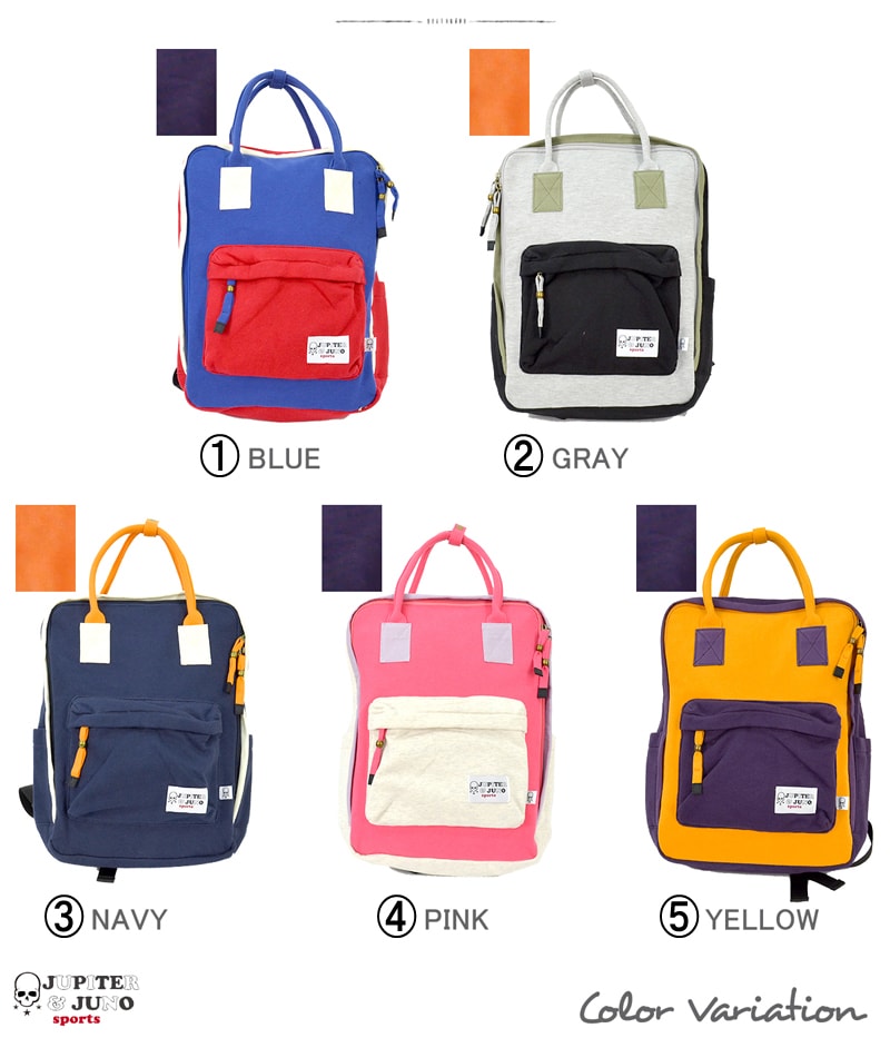 商品名 Jupiter&Juno sports ジュピターアンドジュノ スポーツ 5Colors Sweat Square Rucksack 5色 スウェット スクエア リュック 詳細 スポーティかつカジュアルなラインとして発色の良いスウェット地を採用 裏地にはナイロン生地を使用し、表地のしなやかな素材を強化するしっかりとした骨組 手提げBAGとしても使える2way仕様。