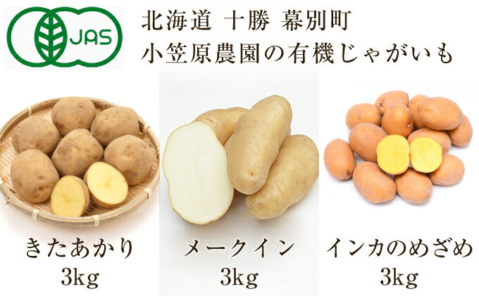 【ふるさと納税】小笠原農園の有機じゃがいも3種詰合せ(きたあかり3kg・メークイン3kg・インカ3kg)【北海道十勝幕別】 【野菜・じゃがいも・セット・詰合せ】 お届け:2020年9月下旬〜12月下旬